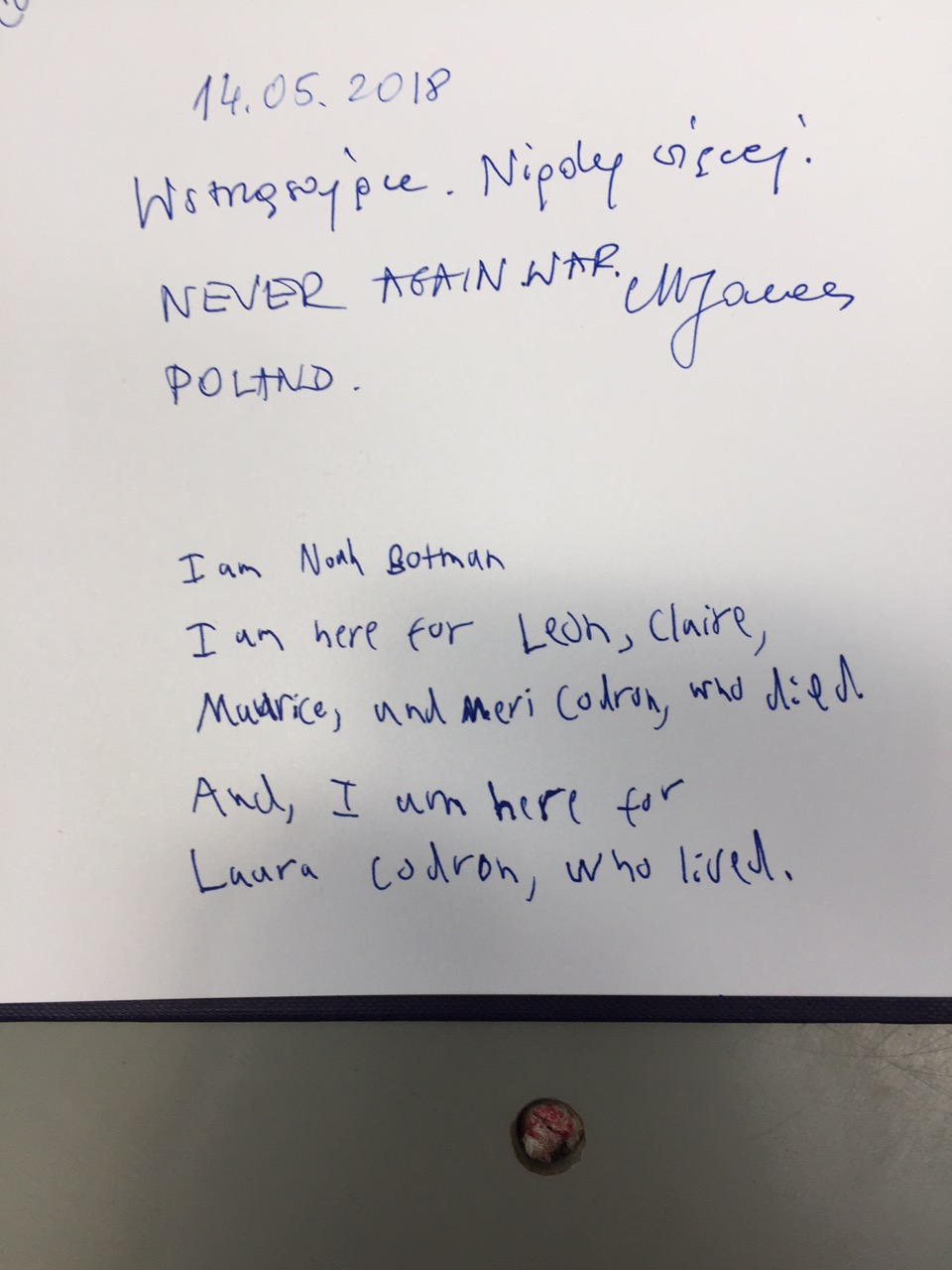 Note left by Noah Botman in the Yad Vashem memory book in honour of Leon Codron, Claire Sonsol, Maurice Codron and Meri Codron (parents, brother and sister of Laura).