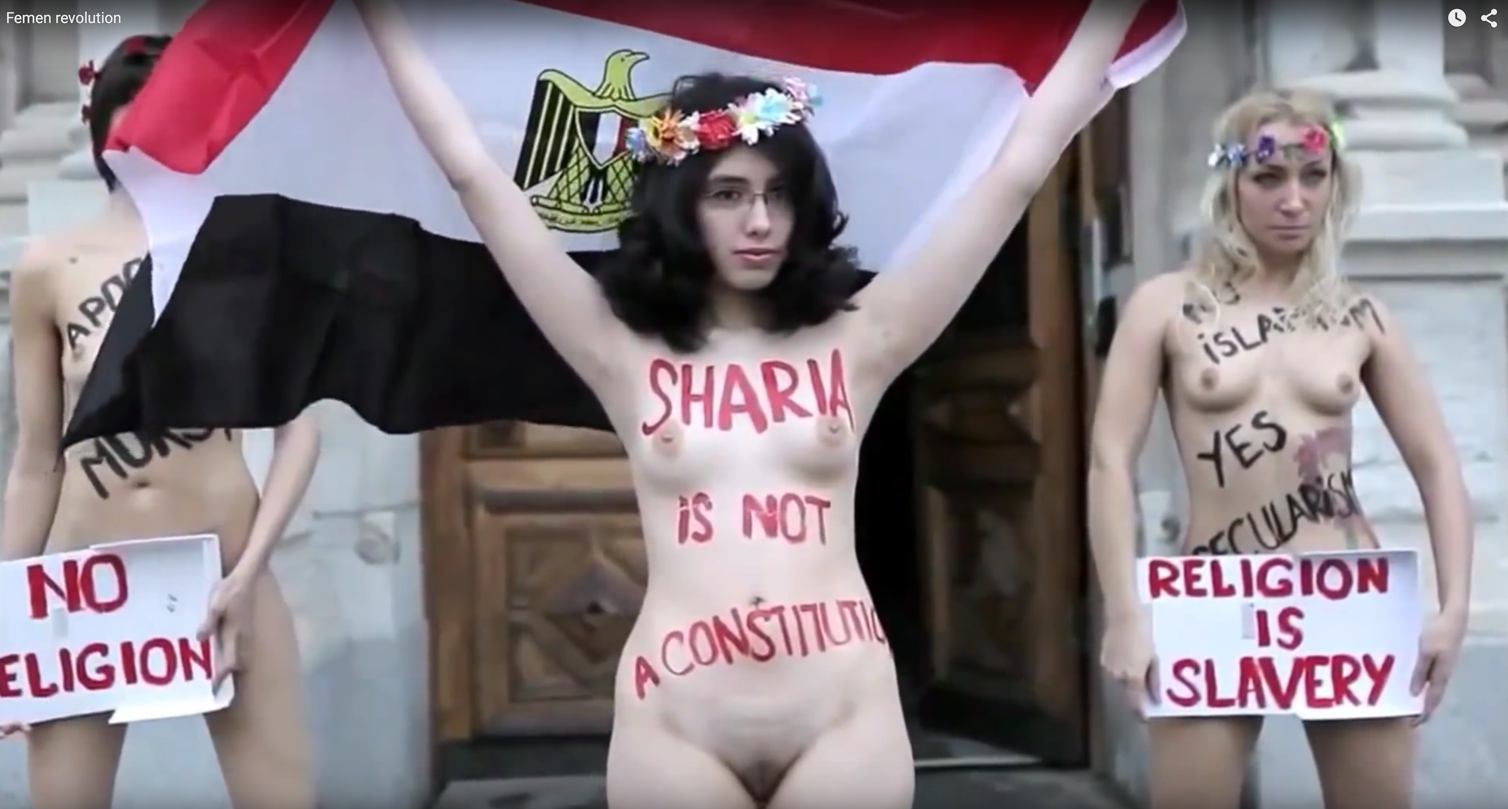 Two young women of Arab descent interrupting a debate on the various motives expressed in Sharia law justifying violence against women. “Nobody submits me,” wrote one of them defiantly on her chest. “I am my own prophet,” wrote the other. Women should not be coerced, forced, intimidated, beaten, they claimed … only to be kicked off the stage – literally and violently – confirming explicitly and unequivocally the very brutality imposed upon Muslim women that the conference was purportedly debating. (Screen capture via You Tube)